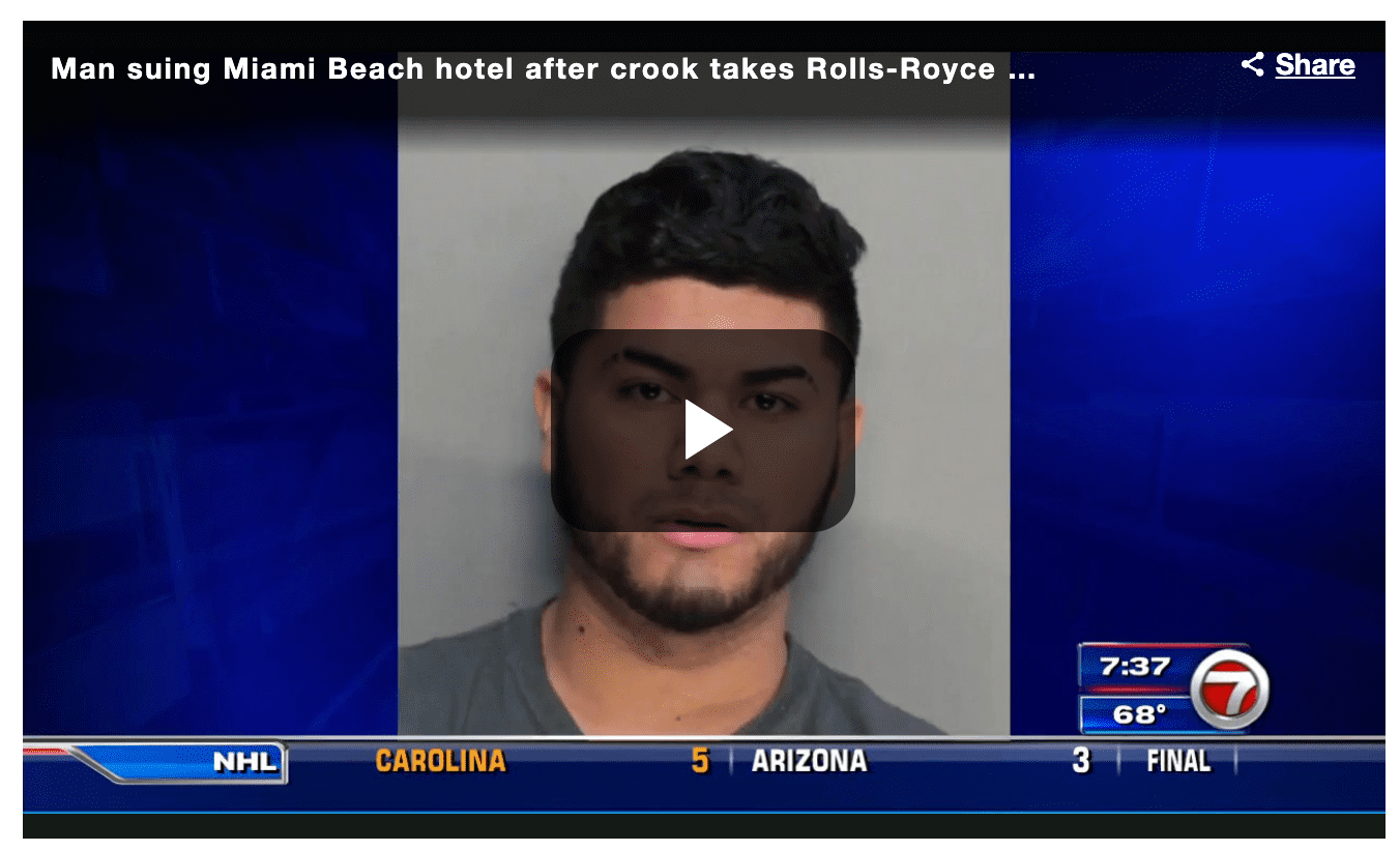 MIAMI BEACH, FLA. (WSVN) – A man has filed suit against a Miami Beach hotel after, police said, a man was arrested for allegedly duping a valet employee and taking his Rolls-Royce for a joyride around the city.