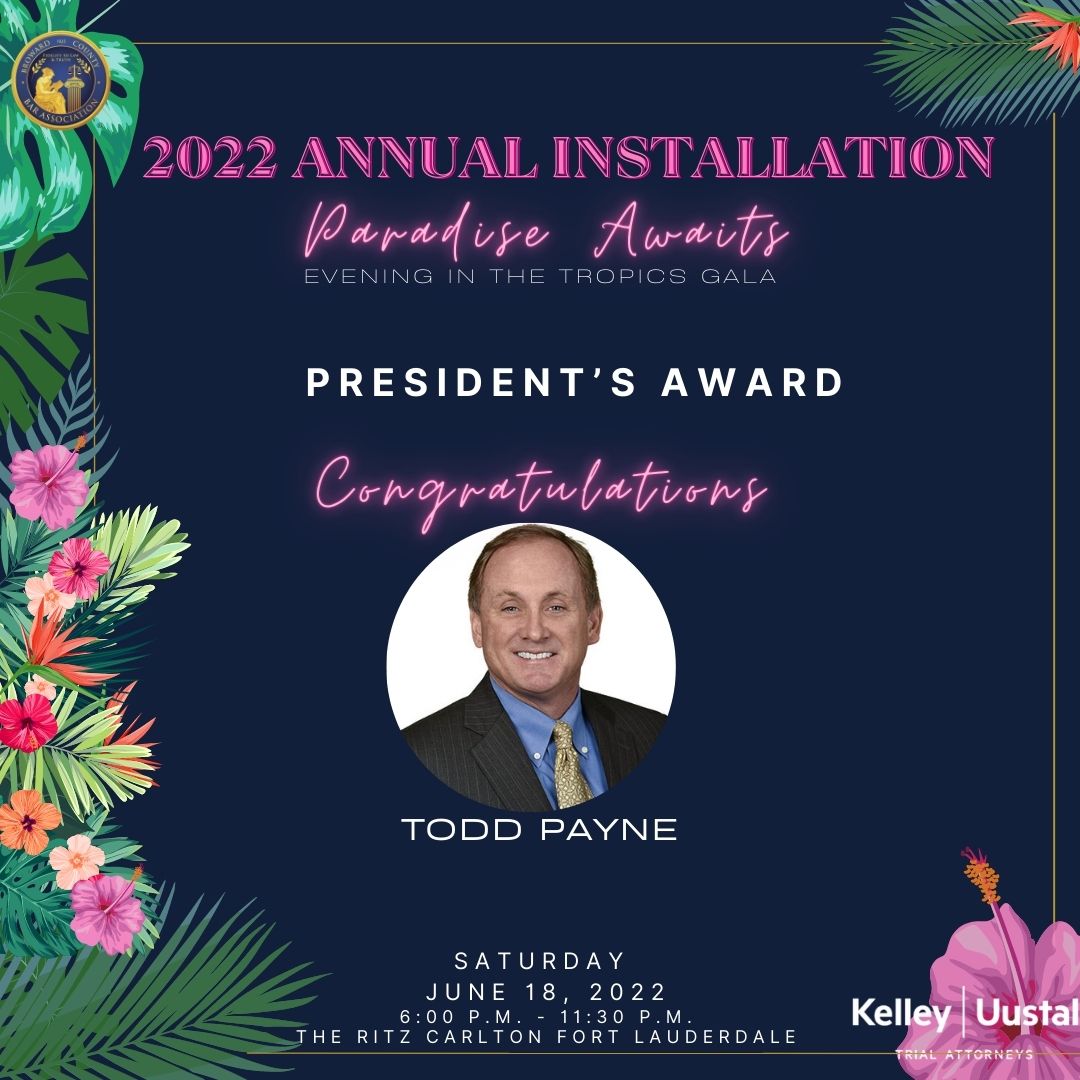 Congratulations to SL’s Partner and CEO, Todd Payne, who was awarded the prestigious “President’s Award” at the Broward County Bar Association’s 2022 Annual Installation Gala!